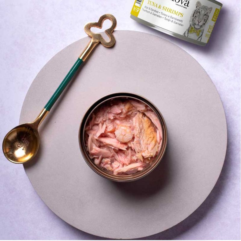 100 % natūralus receptas, idealus katėms, mėgstančioms žuvį, pagamintas iš aukštos kokybės skipjako tuno ir išskirtinių krevečių, toks pat skanus ir maistingas, lyg būtų paruoštas specialiai jums.