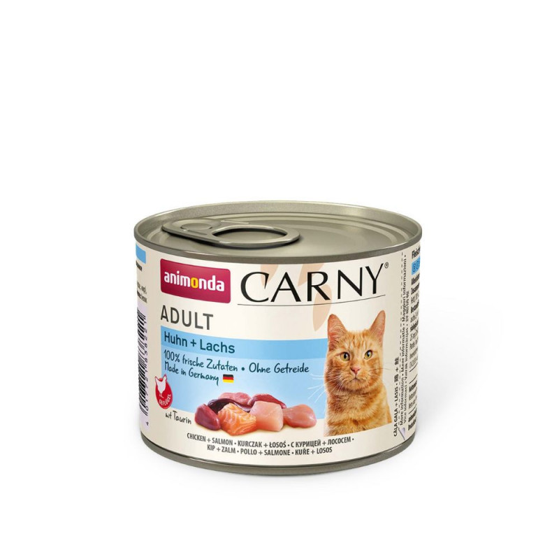 Animonda Carny konservai su lašiša ir vištiena suaugusioms katėms.