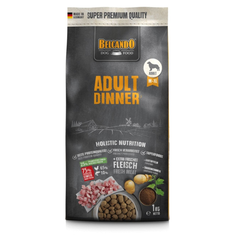 Kruopštus žaliavų pasirinkimas, minkšta paukštiena, bulvės ir šalto spaudimo vynuogių kauliukų miltai suteikia BELCANDO® Adult Dinner idealų maistinių medžiagų derinį suaugusiems vidutinių ir didelių veislių šunims.