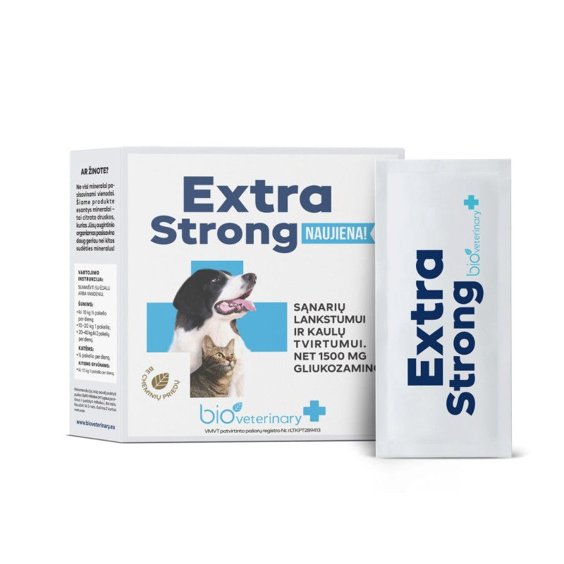 Maisto papildas augintiniams Bioveterinary Extra Strong be dažiklių, konservantų ar skonio stipriklių. Dėžutėje 28 pakeliai.