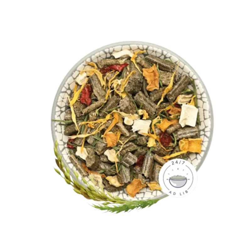 medetkų žiedai, pankolių sėklos, ramunėlių žiedai, džiovintos papajos, alaus grūdai, saldžiavaisio pupmedžio miltai, alaus mielės, kalcio karbonatas, cikorijų inulinas