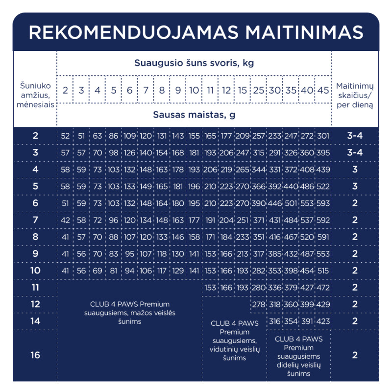 Pašaras turėtų būti palaipsniui įvedamas į maitinimo racioną bent jau pirmąsias 5 dienas. Užtikrinkite, kad augintiniui būtų nuolat prieinamas švarus ir šviežias geriamas vanduo. Individualios maitinimo normos gali skirtis, priklausomai nuo augintinio amžiaus, veislės, aktyvumo lygio ir aplinkos.
