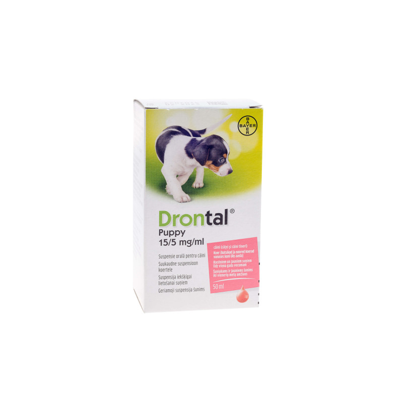 Drontal Puppy geriamoji suspensija skirta šuniukams ir jauniems šunims iki vienerių metų amžiaus dehelmintizuoti nuo apvaliųjų kirmėlių (askaridžių, ankilostomų, plaukagalvių).