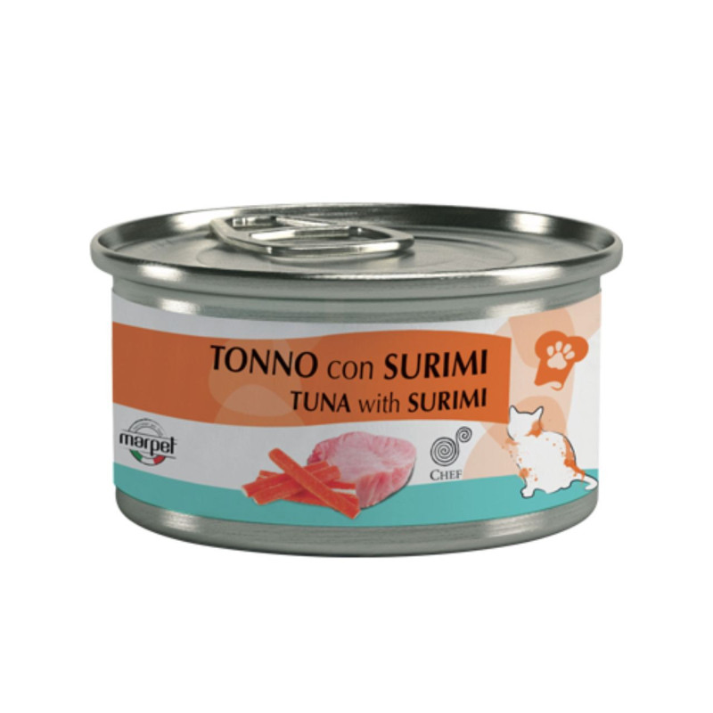 Papildomas pašaras suaugusioms katėms su tunu ir krabų lazdelėmis. Marpet Chef konservai katėms gaminami iš mėsos ir šviežios žuvies juostelių, virtų vandenyje. Skanūs konservai patenkins net išrankiausius gomurius!