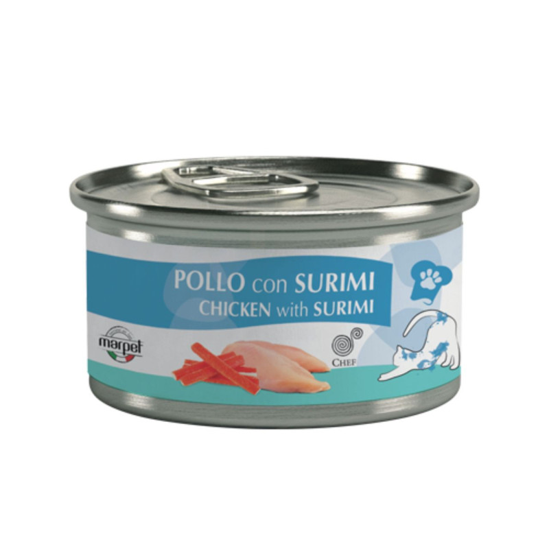 Papildomas pašaras suaugusioms katėms su vištiena ir krabų lazdelėmis. Marpet Chef konservai katėms gaminami iš mėsos ir šviežios žuvies juostelių, virtų vandenyje. Skanūs konservai patenkins net išrankiausius gomurius!