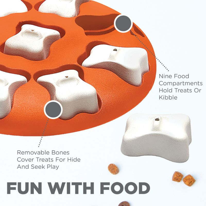 Outward Hound Dog Smart interaktyvi šunų dėlionė – tai smagus būdas sudominti jūsų šunį problemų sprendimo žaidimais! Ši 1 lygio šunų dėlionė turi devynis skanėstų slėpimo skyrius, kuriuos galima pripildyti mėgstamiausiais jūsų šuniuko skanėstais ir uždengti devyniais šuns kaulais, kurie pro viršutinę skylutę skleidžia skanų skanėstų kvapą.