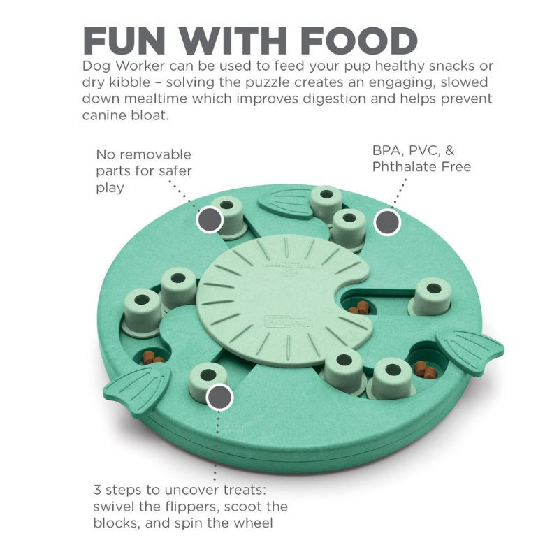 Nina Ottoson Dog Worker žaislas turi 3 žingsnius, kuriuos jūsų šuo turės išmokti, kad gautų skanius apdovanojimus: pasukti plaukmenis, pastumti kaladėles ir pasukti centrinį ratą. Paslėpti skyriai yra po plaukmenimis ir po centriniu ratu. Galima rinktis iš įvairių spalvų. Pagaminta be nuimamų dalių iš kompozicinės medžiagos be BPA, PVC ir ftalatų. Valyti šiltu vandeniu ir muilu.