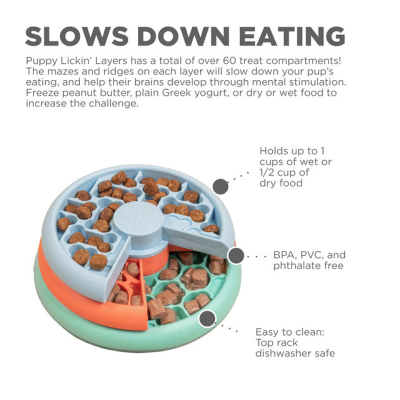 Nina Ottoson Puppy Lickin' Layers galvosūkis turintis daugiau, nei 80 skanėstų skyrių, užims šunis ir leis jiems įsitraukti. Jo talpa yr pakankamai didelė, kad būtų galima naudoti kaip lėto valgymo dubenėlį, siekiant pailginti valgymo laiką ir paskatinti jūsų šunį ėsti lėčiau, sveikiau. Padidinkite iššūkį užšaldydami žemės riešutų sviestą (be ksilitolio), šlapią maistą arba paprastą graikišką jogurtą! Lickin' Layers pagamintas iš maistui saugių medžiagų, kurių sudėtyje nėra BPA, PVC ir ftalatų.