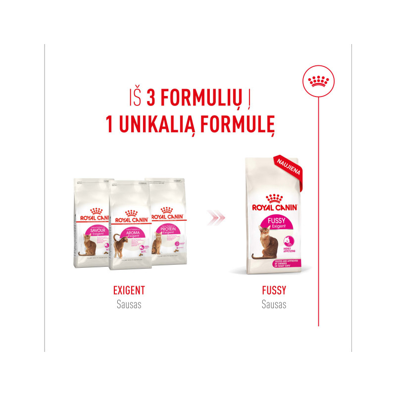 - Naujos kartos Fussy formulė. Sujungia ankstesnes „Exigent Savour“, „Aroma“ ir „Protein“ dietas į vieną visapusiškai subalansuotą ir skoningą produktą.