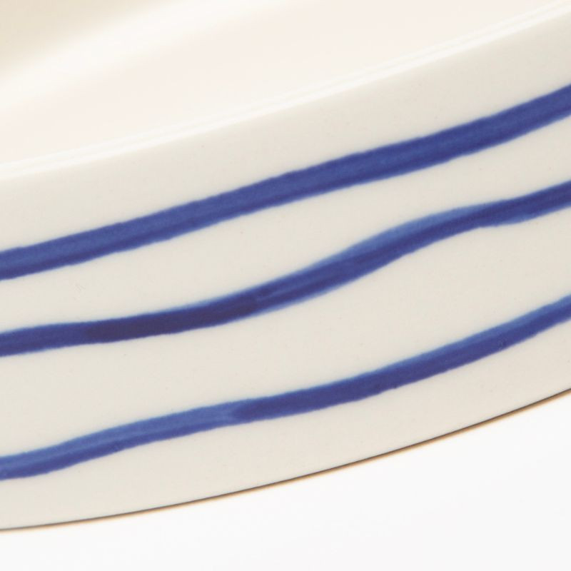 Stilingas baltos spalvos šunų dubenėlis su mėlynomis bangelėmis – puikus pasirinkimas tiek maistui, tiek vandeniui.