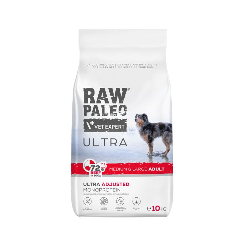 Raw Paleo Ultra yra visavertis ir subalansuotas sausas pašaras suaugusiems vidutinių ir didelių veislių šunims (vyresniems nei 1 metų amžiaus), kurių kūno svoris viršija 8 kg.