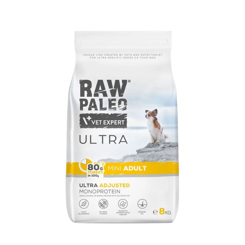 Raw Paleo Ultra yra visavertis ir subalansuotas pašaras suaugusiems mažų veislių šunims (vyresniems nei 1 metų amžiaus), kurių kūno svoris neviršija 8 kg.