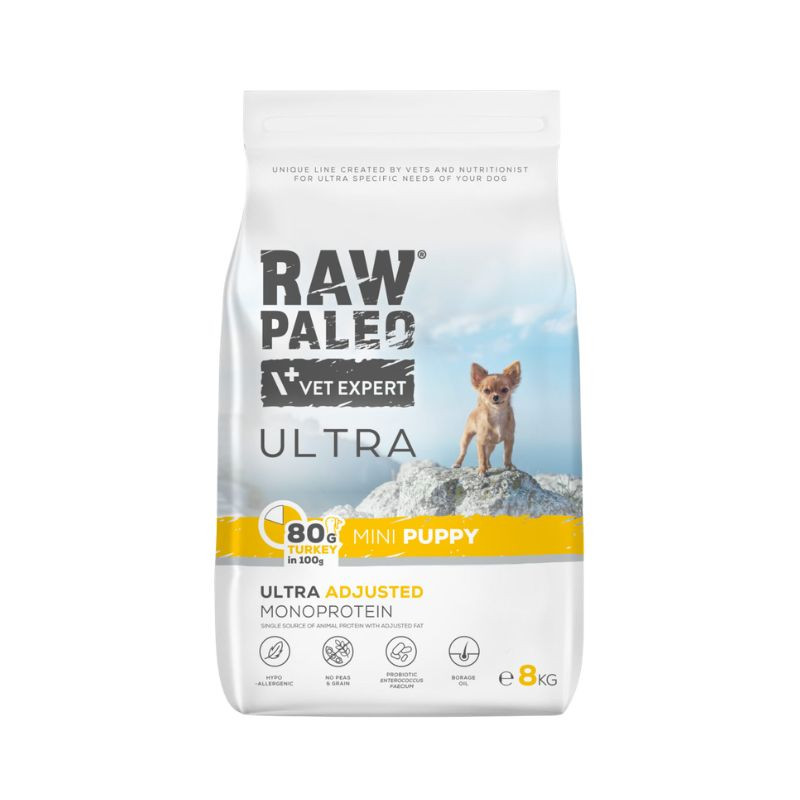 Raw Paleo Ultra yra visavertis ir subalansuotas sausas pašaras augantiems mažų veislių šunims (nuo nujunkymo iki 8 mėnesių amžiaus), kurių kūno svoris suaugus neviršija 8 kg.